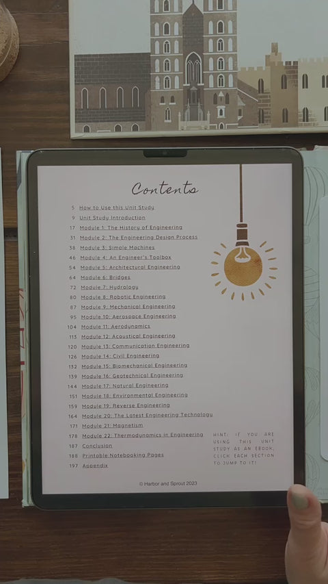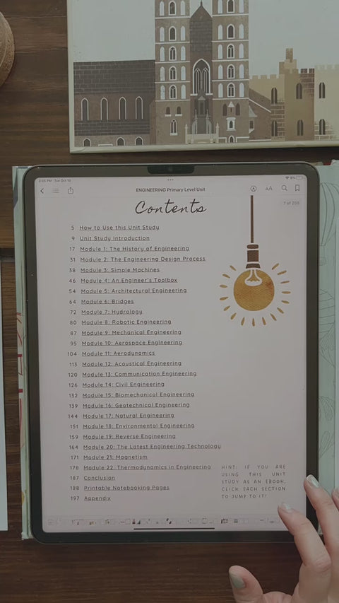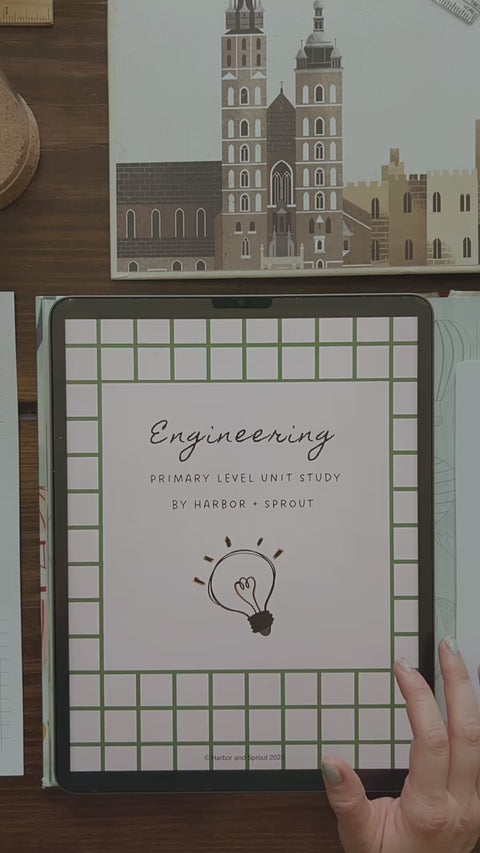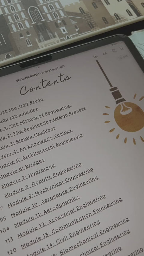 Welcome to the fascinating world of Engineering! This unit study is designed to guide learners aged 6-12 on an in-depth exploration that will not only provide a thorough study of the subject at hand, but will also involve students in the process through immersive, experiential learning opportunities. Consistent, gentle, and easy-to-follow structure encourages internalization and personal connection with each module.